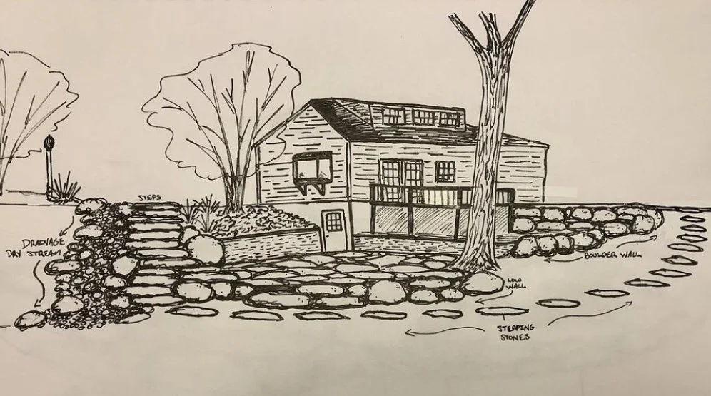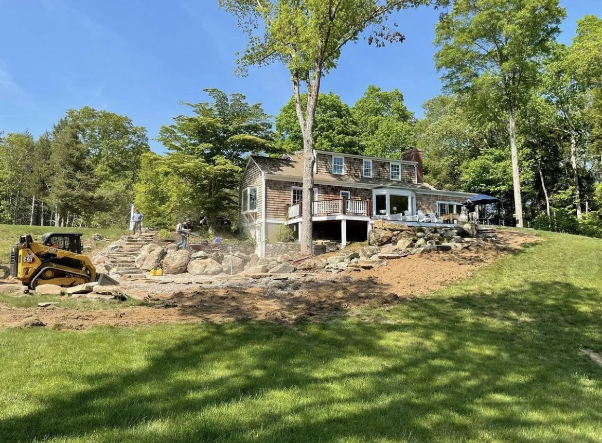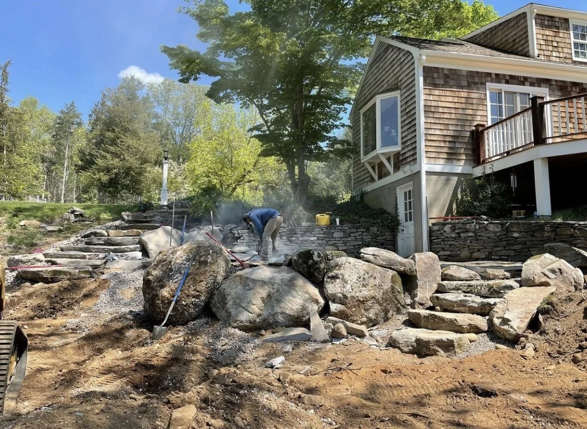 All the stone for this project was found directly on-site in the woods — every patio stone, every step, every boulder. This build included two patios, one by the back door to the house and one by the pond on the lower lawn area, as well as stepping stones around a future hot tub space that connects to a set of stone stairs leading up the steep hill to the house. A new boulder wall safely eliminates the drop-off from the back deck to the house. All of this accomplished with stone resourcefully found on-site, adding rustic beauty and function to this outdoor space.