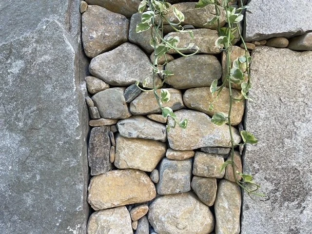 Small niches carefully built into the structure allow for plantings or decor, bringing an added sense of ambiance and character. Every angle lends itself to something new and interesting to look at — small details within the placed fieldstone, pebbles, lichen, or color and texture variations in the granite.