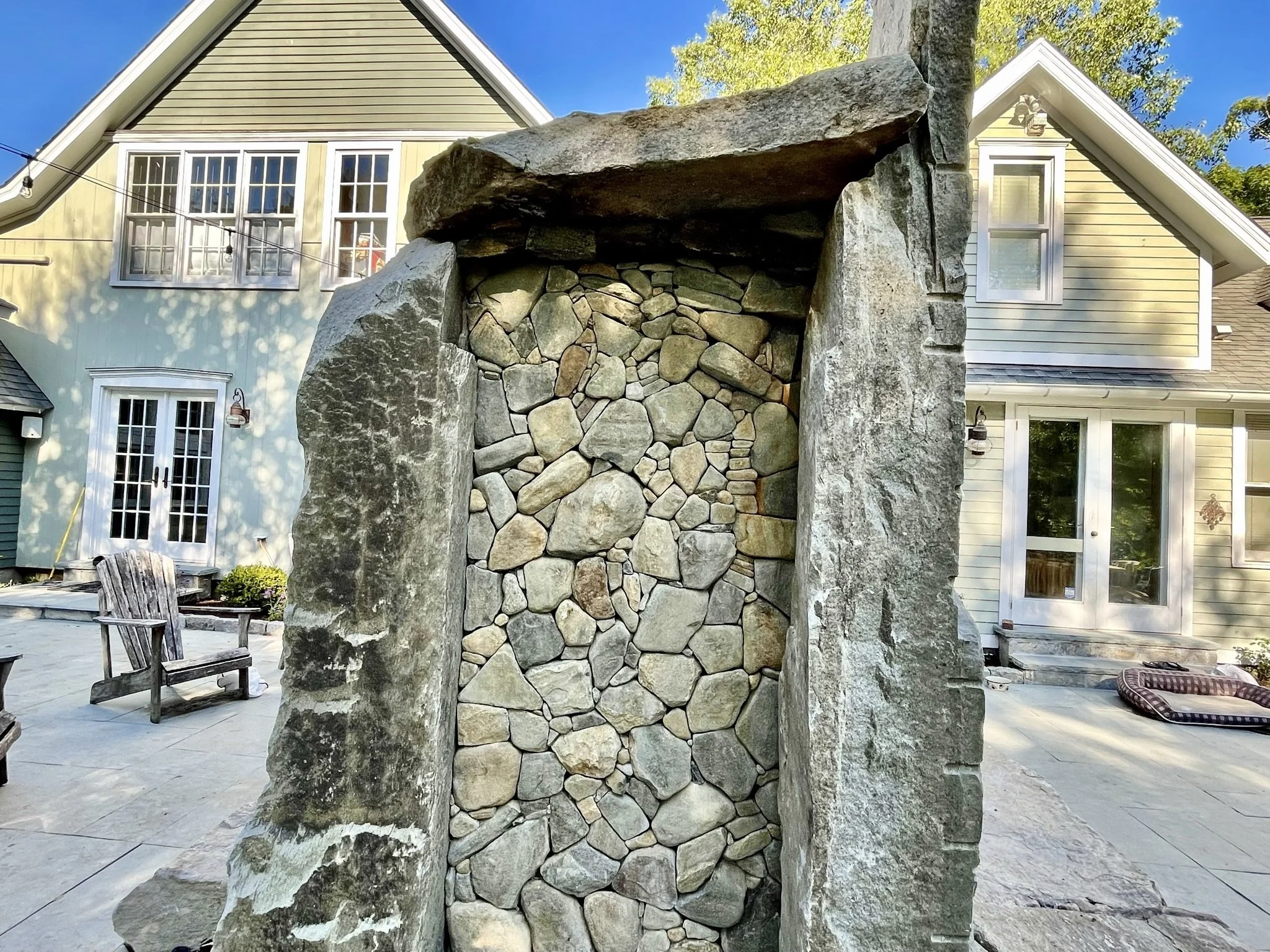 An epic and totally custom freestanding stone fireplace, inspired by the very same stones within it, crafted to create two unique outdoor rooms. Every single stone was handpicked from a local granite quarry and fieldstone farm, down to the tiny pebble details. The fireplace effortlessly divides the outdoor space into two distinct rooms, each with its own ambiance and purpose. Both areas exude a sense of conviviality and togetherness, two outdoor rooms where laughter and conversation fill the air. Step into these outdoor rooms, and immerse yourself in a symphony of craftsmanship and nature's bountiful wonders.